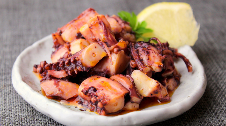 From there, add sliced shallots, minced garlic, paprika, red pepper flakes, or chopped herbs to your pan. You'll want to saute it at low temperatures for up to 15 minutes, until the edges look nice and crispy, and finish it off with a dash of lemon juice. While your octopus will be delicious if you gobble it up as-is, perhaps with some crusty bread, you can also experiment with adding it to pastas, soups, stews, tacos, salads, and side dishes with veggies. Or try your hand at frita de pulpo, a classic dish from Ibiza that pairs boiled octopus with fried onions, peppers, potatoes, garlic, and a bay leaf. All it takes is a quick saute, and you've opened the door to a ton of tasty octopus-infused meals.