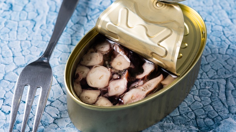 Canned octopus may sound like a complete novelty, but with the tinned seafood market climbing to $35.27 billion in 2024, you may see it occasionally on grocery store shelves. And yet, we don't blame you if canned octopus seems a little unappetizing. The mollusk has a light, mild flavor and a texture that ranges from soft to chewy. In short, it doesn't taste like too much on its own — but if you cook it properly, it can convert from a rather bland seafood into a tasty treat.
