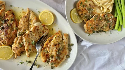 Chicken scallopini makes for an excellent dinner main course, though since the recipe consists of just protein and sauce, there's a good chance you'll want to pair it with other foods to round out the meal. "I like to serve chicken scallopini with a simple side of fettuccine alfredo and steamed veggies," De Witt suggests, adding, "A Caesar salad would pair nicely, as well." You can't go wrong with creamy pasta, and a relatively neutral vegetable such as asparagus would complement the bright flavor of the chicken without overpowering it.