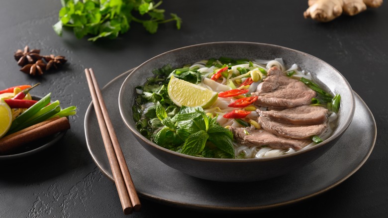 There are a number of methods to make this cozy beef noodle soup, and recipes can differ depending on how much time you're able to spend. Most recipes require the use of a range of beef bones and seasonings like cloves, star anise, Chinese cinnamon, ginger, and white pepper for the broth. After cooking your broth and rice noodles, add everything to a large bowl with raw, sliced beef. Thanks to the use of super-thin steak, the piping hot broth will quickly cook the beef, leaving you with tender, medium-rare steak. Be sure to add lots of garnishes — any combination of jalapeños, chilis, bean sprouts, Thai basil, scallions, cilantro, onions or lime wedges will work well. You can also add extra sauces like Sriracha or hoisin sauce for added spice and depth of flavor.