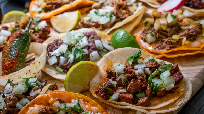 While you can't go wrong with any type of protein, shaved steak is one of the best ways to enjoy this popular Mexican dish. Either cook your beef in a variety of spices (adobo sauce, chipotles, cumin, chili powder, lime juice, salt, and pepper work great for beef street tacos), or you can try marinating the steak ahead of time in a combination of jalapeño, garlic, cilantro, cumin, salt, pepper, soy sauce, olive oil, orange and lime juice, and vinegar for one to four hours. You'll be left with savory, delicious carne asada, perfect for grilling and serving on corn tortillas, topped with chopped onion, cilantro, cotija cheese, and a squeeze of fresh lime.