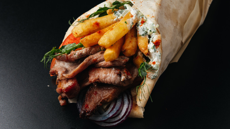 While gyros hail from Greece, this popular street food can be found in different forms throughout the world. Shawarma in the Middle East, döner kebabs in Turkey, al pastor in Mexico, and gyros all utilize meat that has been cooked on a vertical rotisserie before being cut into thin slices. Some even claim that this classic dish didn't even come to Greece until the 1920s due to refugees from Constantinople and Smyrna. In the 1960s, gyros were introduced to the United States and have since become a Greek staple. For the Greek gyro, lamb, beef, or chicken are all favorable options, which are then dressed with pickled onions, feta cheese, tomato, and tzatziki sauce (an herby yogurt-based sauce made with cucumbers and garlic) and are all tucked into pita bread.