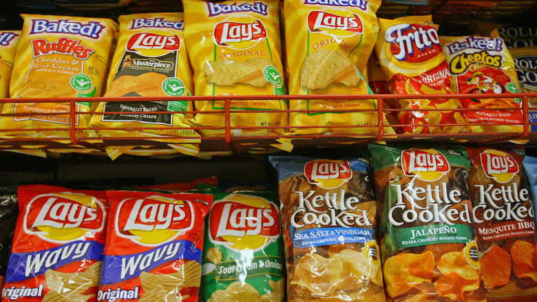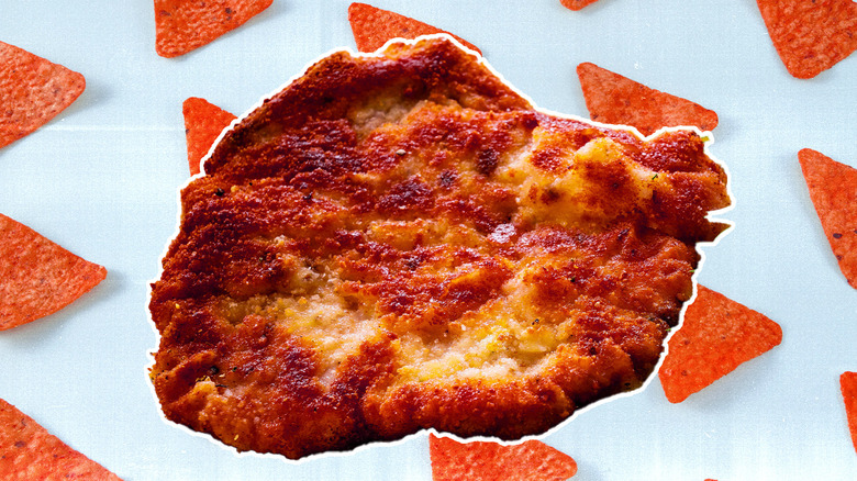 There's no getting around it: Pork chops are a versatile cut of meat. They can be grilled for a smoky char, roasted with pungent herbs, or even prepared with the sous vide method and pan-seared for the perfect combination of juicy interior and flavorful crunch. If you want to take that pork chop crunch up a notch, though, you have to go for a preparation that's a bit retro: breading and pan-frying. And if you want that crunch to be satisfyingly shattering and flavorful, step away from the breadcrumbs and give chips a chance. These crispy, flavorful snacks aren't just for munching anymore — they make a delectable coating for pork chops whose tender meat yields under a blanket of crispiness.