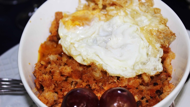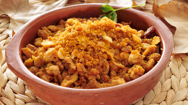 Unlike the egg-scrambled Mexican migas, Spanish migas are typically a lunch or dinner dish with the consistency and richness of Thanksgiving stuffing. While bread crumbs, chorizo, and olive oil are the foundational ingredients, they're also a jumping-off point to elaborate with your favorite spices, herbs, garnishes, and veggies. For example, you could add diced yellow onions, red bell peppers, and mushrooms for a trifecta of caramelized, smoky, and umami flavors to complement spicy garlic and paprika-infused chorizo. Some recipes suggest adding dried cranberries or fresh grapes and pomegranate seeds for a bright, sweet contrast.