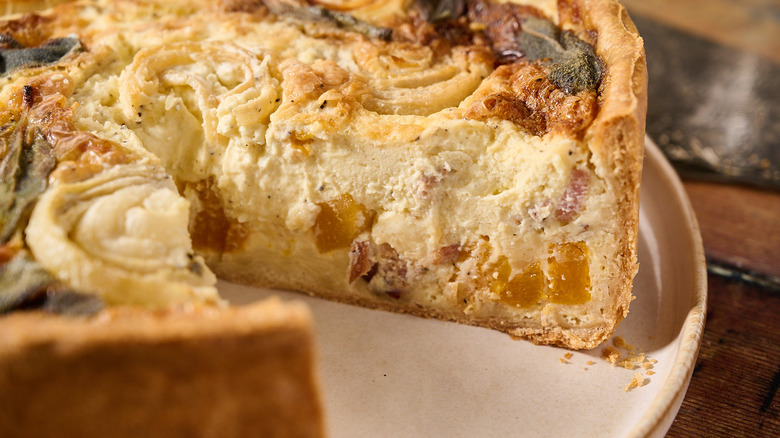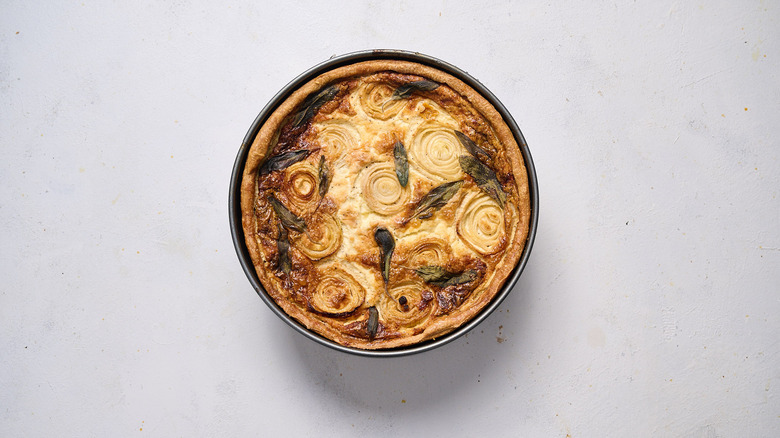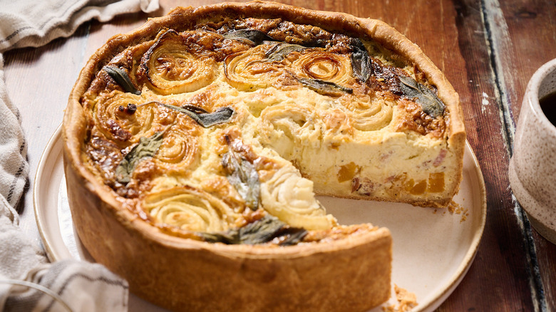 We'll be honest with you — not all recipes are quick and easy 30-minute meals. This deep-dish quiche recipe is quite the opposite but well worth the time. After all, quiche is not your average bacon-and-eggs breakfast. At its simplest, quiche is an egg-based pie made with milk and cheese. It's soft and custard-like but sturdy enough to be cut into slices for an elegant presentation. In this recipe written with developer Michelle McGlinn, the egg, milk, and cream are joined by fall-forward flavors like butternut squash, bacon, and crispy sage, then topped with rounds of onion that caramelize sweetly into three types of melty cheese. To make this tall, deep-dish style quiche, you'll need a springform pan, usually used for making cheesecakes. A simple, buttery crust is pressed into the pan and pre-baked (also called blind baking) until golden, then filled with Fontina, Gruyère, Parmesan, the squash and bacon, and a smooth egg filling. This isn't really the recipe you pull out for busy Monday mornings, but it does make a seriously stunning surprise for special occasions. And, it's not just a pretty meal, either: It may also be the best quiche you've ever tasted.