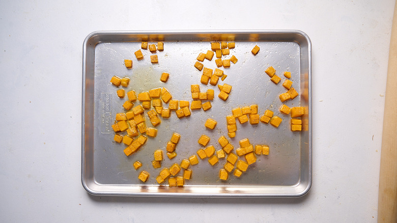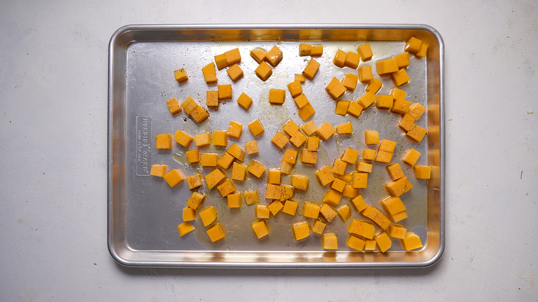 - In the meantime, spread the butternut squash cubes on a baking sheet. Drizzle with oil, then season with 1 teaspoon each salt and pepper.