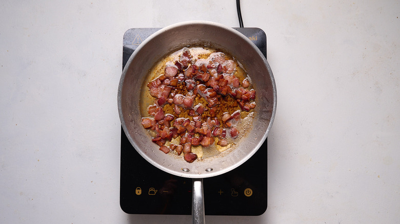- Add the butternut squash and bacon to the shell, reserving about 2 tablespoons of each.