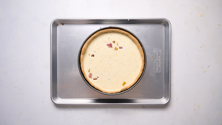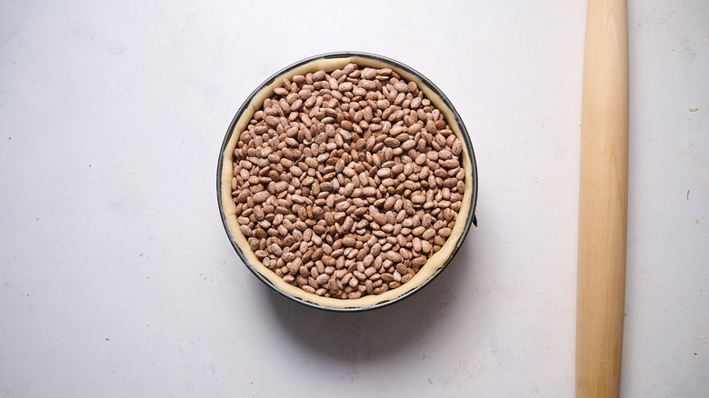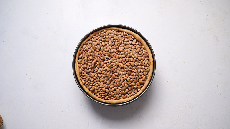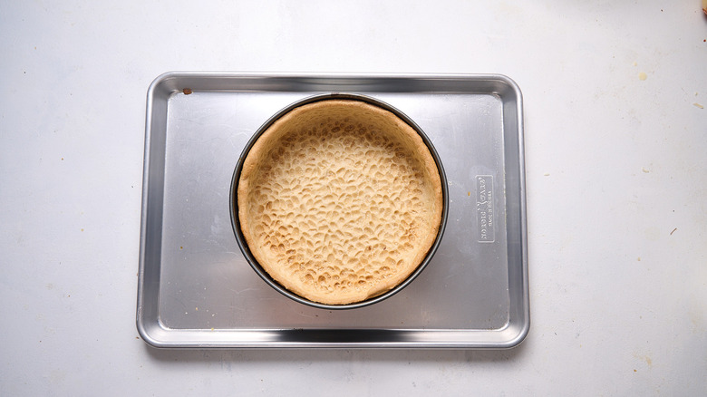 Once the crust is golden, remove the beans or pie weights and place the springform pan on a baking sheet.