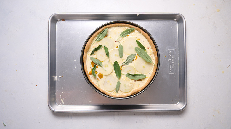Though the recipe is complicated, you don't need many ingredients, and many will already be in your pantry. To make the crust, grab all-purpose flour, butter, salt, and water. We recommend making the crust yourself for the best results, but a frozen deep-dish pie shell will work in a pinch. From there, you'll also need olive oil, a small butternut squash, bacon, eggs, heavy cream, milk, Parmesan cheese, Fontina cheese, Gruyère cheese, a small yellow onion, and some fresh sage. If butternut squash is out of season and no longer in stores, swap it out for sweet potato.