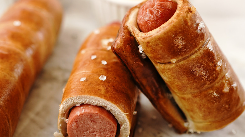 The pretzel dough and cocktail weenie combination might seem unexpected, but it is totally worth it. And if you've never made your own homemade pretzel dough before, fear not; you can make a few simple swaps to have Auntie Anne's-style dough at your fingertips. You can instead take store-bought pizza dough, wrap it around your cocktail weiners, and boil it in a bath of baking soda and water before coating it with an egg wash and baking. The baking soda is critical to developing the malty flavor and unique brown color we know and love on our pretzels, and it won't alter the flavor of the wiener tucked inside.
