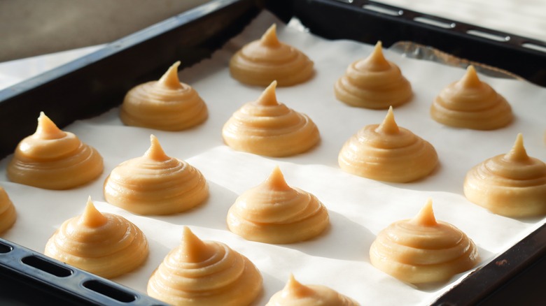 The first step is making your choux pastry and then plopping it onto your baking sheet. You'll want to make little ovals that are just about the size of your cocktail sausage. Then, once the puffs have baked and cooked down, you can cut a small hole in the center and drop in a warmed sausage. The texture of this appetizer is between that of a standard puff pastry cocktail weiner and a corn dog — but it is so worth it.