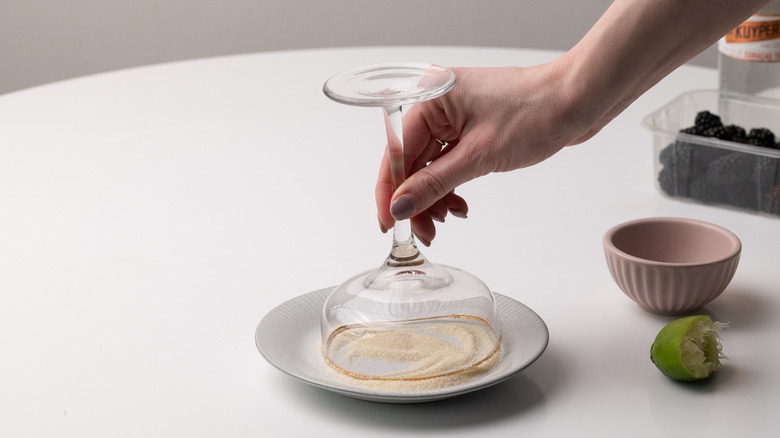To begin this botanical blackberry sage margarita recipe, you will first need to gather the ingredients. You will want sugar, a lime, blackberries, sage leaves, tequila, triple sec, and simple syrup.