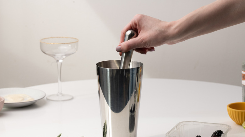 - Add 6 blackberries and 2 sage leaves to a cocktail shaker.