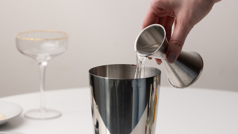 Add tequila, triple sec, and simple syrup to the cocktail shaker.