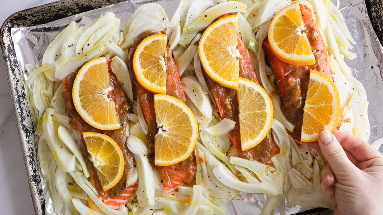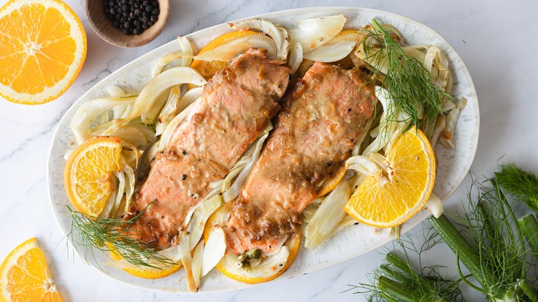 Citrus and seafood are a natural pairing across many dishes; the acidity in citrus lends itself to being a great balancing ingredient across a variety of seafood. Oranges and salmon are one example of this pairing that really shines. The subtle sweetness in oranges balances out the fatty flavor in salmon excellently and you can lean into this rich flavor pairing by upgrading your oranges to include marmalade. Tasting Table recipe developer Ksenia Prints uses this addition in her orange marmalade salmon with roasted fennel recipe.