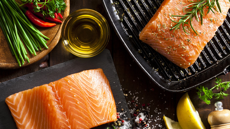 Poaching involves slowly simmering your food at a low heat until it's tender. While this is often achieved with water, broth, wine, or milk, olive oil is an incredible choice for poaching salmon. It has a grassy, peppery flavor that makes the fish take on an earthier note, resulting in something much richer than its usual sweetness. As a fat, olive oil delivers buttery smooth salmon that melts into your mouth. To keep the notes of the olive oil intact, it needs to be cooked at a lower temperature; 180 F should do the trick.