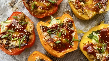 Clean out the fridge by making a rice- and veggie-packed bibimbap, stuffing it into baked bell peppers, and topping them with eggs and a gochujang-based sauce.