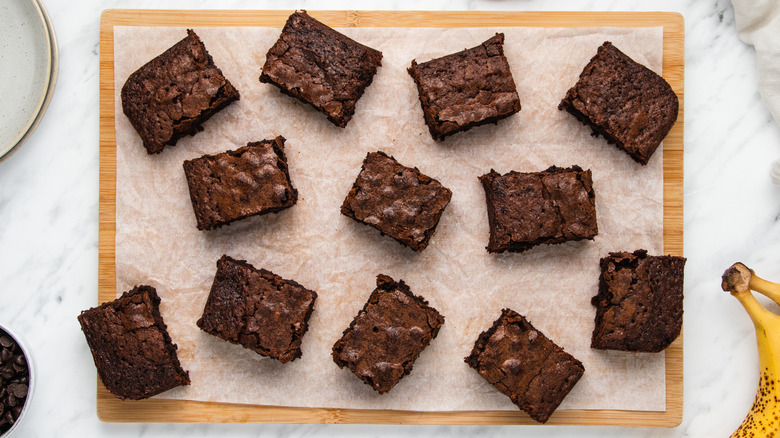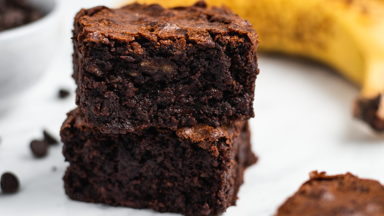Banana bread is delicious, but if you've got some ripe bananas and a craving for chocolate, a batch of chocolate banana brownies is exactly what is called for. Chocolate and banana is a classic flavor combination, of course. Sprinkle some chocolate chips into your banana muffins, and you'll see what we mean. And, in this case, the mashed fruit adds extra moisture to the batter for a rich and fudgy brownie that will be good at room temperature for three days — if you can resist snacking on them all at once.