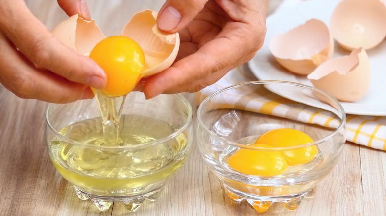 One of the simplest ways to make the process of separating yolks and whites easier is by using chilled eggs. At room temperature, eggs have a tendency to be more liquidy, which can pose a challenge during separation. The yolk is far more slippery and is likely to separate and spill into the egg white mix. To avoid this, simply store your eggs in the refrigerator, or pop them in at least 30 minutes before you want to use them. If you often store your eggs outside of the fridge, you'll almost certainly notice a positive difference when cooking with and separating chilled eggs.