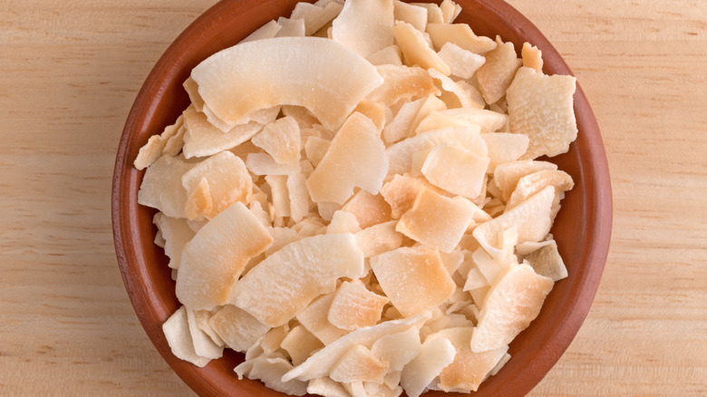 While ready-made toasted coconut is available in some supermarkets, it's a breeze to make your own batch. The process is as straightforward as placing your shredded coconut in a cake tin that fits snugly into your air fryer (so it stays contained within the dish and doesn't fall into the base of the appliance) before air frying for 5 minutes or so at 300 degrees Fahrenheit. However, there are two crucial steps to this method that you must follow to guarantee that your coconut toasts up perfectly. Firstly, it needs to be spread out in a thin layer so it can brown quickly and evenly. Secondly, you need to give the shreds a shake every couple of minutes to prevent them from burning on one side. Monitoring your shredded coconut also allows you to immediately remove it from the air fryer if it looks like it's moments away from catching on the base of the pan.