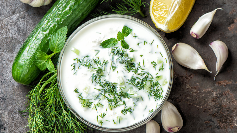 Preferences and special add-ins aside, classic potato salad is made with mayonnaise, mustard, red onions, and dill pickles. Creamy, tangy, and brimming with fresh herbs, tzatziki contains similar elements. The Greek sauce is comprised of strained yogurt, garlic, olive oil, lemon juice, and shredded cucumber. While it has just a touch of sweetness from the cucumber, tzatziki is brimming with zesty notes, just like in any potato salad. Often garnished with dill or mint, the herbaceous sauce is the perfect match to the potato's buttery taste, making the two a natural pair.