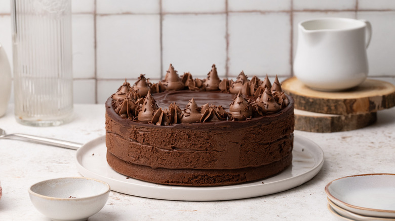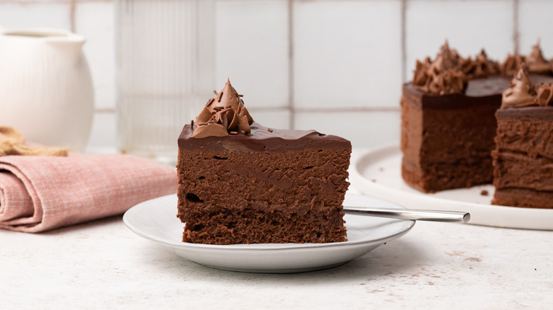 If you adore chocolate, but a chocolate cake by itself doesn't get your heart racing, or, if you are looking for something a little different as well as decidedly decadent, why not consider making a chocolate mousse cake? This dreamy dessert combines the silky smooth creaminess of homemade dark chocolate mousse, a light and airy chocolate sponge base, and a rich dark chocolate ganache to make a cake that is the perfect indulgence. Created by Tasting Table recipe developer Jennine Rye, this dreamy decadent chocolate mousse cake recipe certainly requires more effort than the standard chocolate cake, but it is well worth the effort.