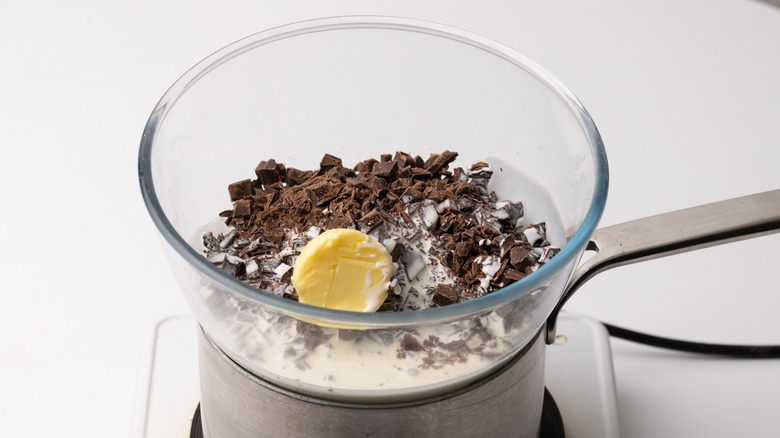 - Add the dark chocolate, remaining ¾ cup cream, and the tablespoon of butter to a bowl set over a saucepan of hot water.