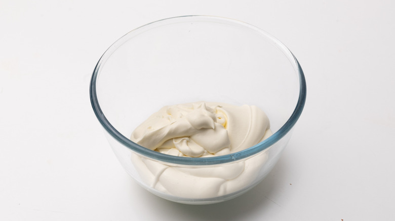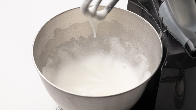 - Add the 3 egg whites to a stand mixer and whisk on high for 1 to 2 minutes until peaks form.