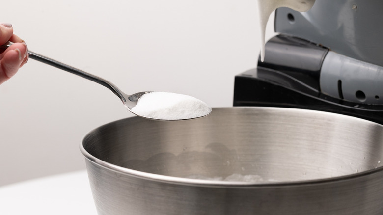 Feed the 4 tablespoons of sugar into the egg whites and keep beating until the sugar has completely dissolved.