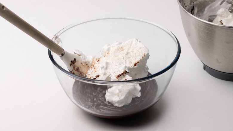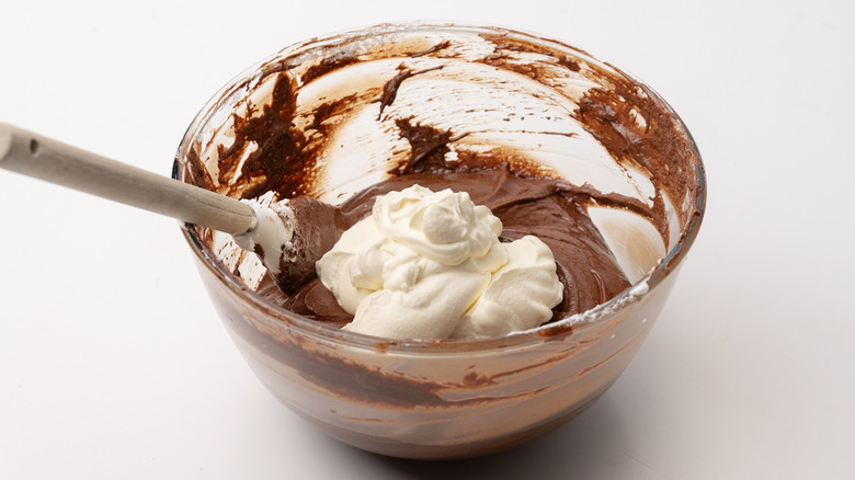 - Fold the chilled whipped cream from the fridge into the chocolate mixture.