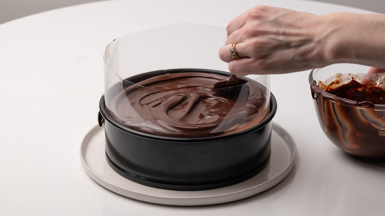 Pour the chocolate mousse onto the cake base in the prepared tin.