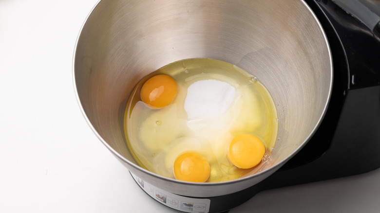 - In a stand mixer, beat together the sugar and eggs for 6 to 7 minutes until the mixture is thick and pale.