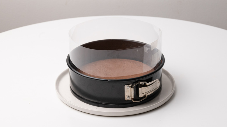 - Once cool, remove the cake from the tin and wrap a clear cake collar around it before placing it back into the cake tin.