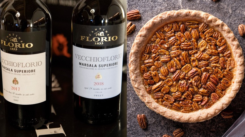 We suggest a sweet marsala wine from Sicily, like Vecchioflorio Sweet Marsala Superiore. The wine ages for at least two years in oak casks, imparting sweet spice, vanilla, and nutty notes into the late-ripening fruit's raisin, dried fig, and caramel notes, perfect with the pecan pie pairing. As the duo has ample sweetness, we suggest a simple, unsweetened whipped cream topping, allowing the wine's natural flavors to shine.