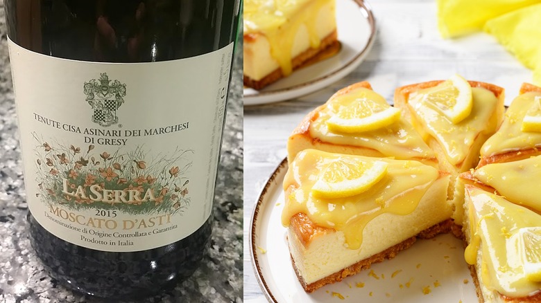 A tangy lemon cheesecake provides both tart and creamy flavors coming from the high acidity of the citrus and the cheese's fattiness. The dessert needs a wine pairing that will complement the zesty acidic notes, refreshing the palate while still standing on its own, ensuring its rich flavors don't mask the wine's taste. A light, sweet, fruity moscato d'Asti will pair nicely with the cake.