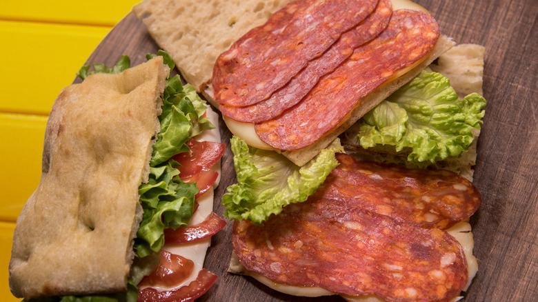 Soppressata and capicola have plenty in common. They both come from pigs — albeit different parts — they both contain plenty of fat, and they both feature rich, tasty flavors. There are some sandwiches that include both of these sliced meats, but because of the way they're cut, seasoned, and cured, you wouldn't always use capicola in the same place that you'd deploy soppressata. These meats have different nicknames, backgrounds, tastes, and textures, and it takes a little understanding of each to figure out how to make the most of them.