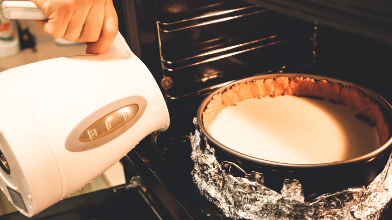 You can create a water bath by setting the baking tin inside of a larger roasting pan filled partially with steaming water. One way to do this is by placing the cake tin with the batter in it directly into the water bath. First, you'll wrap the outside of the cake pan in foil to protect the cake batter from the hot water (especially if you're using a springform pan). Then, fill the tin with cake batter, place it in a larger metal roasting dish, and place them both on the middle shelf in your oven. Pour hot, steaming water into the roasting dish unti it reaches halfway up the length of the cake tin, close the oven, and bake.