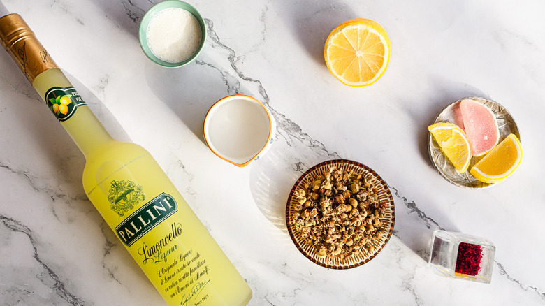 For the lemon sunshine Easter cocktail, reach first for heavy cream and limoncello, which are the creamy and citrus components of the drink, respectively. Fresh lemon juice and simple syrup will add tartness and sweetness. You'll infuse saffron threads and chamomile flowers into the cream for their distinctive flavors. To complete the cocktail, have ice cubes ready for shaking and lemon wheels or sweet lemon candy on hand for garnishing the finished beverage.