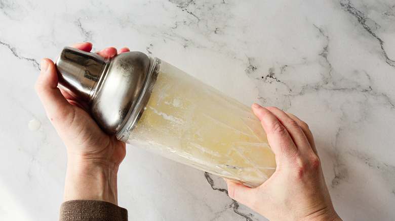 - Combine the limoncello, fresh lemon juice, simple syrup, and infused heavy cream in a cocktail shaker.