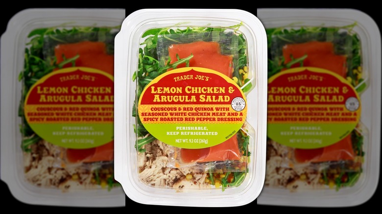 Grab-and-go salads have been a fixture in supermarkets and even gas stations for years. Although convenient for an office worker with a far-too-short lunch break or a road-tripping family looking for lighter options, most stores' pre-made salad options are underwhelming, to say the least. How appetizing can a wilted Caesar or a soggy-looking southwestern salad really be? Trader Joe's ready-made salad section, on the other hand, boasts a large assortment of fresh, innovative salads that are sure to shake you out of your mid-day slump, and one of the very best options is the lemon chicken and arugula salad.