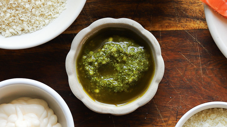 Gather the ingredients for pesto-crusted baked salmon