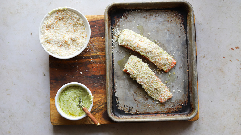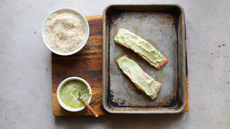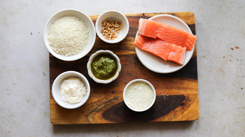 This recipe is simple and straightforward, to allow you to pair it whatever your heart desires. Once you've secured a couple of fresh salmon fillets, you can gather the other ingredients. We'll make a quick pesto and mayonnaise mixture to add flavor and give our crust something to stick to. The crust itself will be made from a mixture of panko bread crumbs, grated Parmesan cheese, and toasted pine nuts. The two latter ingredients are not strictly necessary, but add flavor to the crust. Also, make sure that your pine nuts are toasted before putting them to use.
