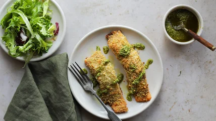 Make dinner a simple affair with this pesto-crusted baked salmon recipe, which comes together in less than 30 minutes.