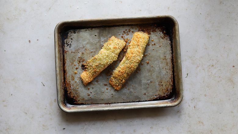 - Transfer to a rimmed baking sheet and bake until golden brown and salmon is cooked through, 16-18 minutes.