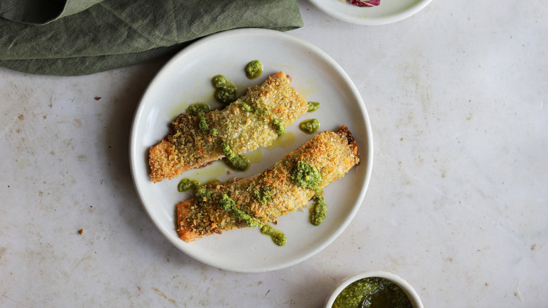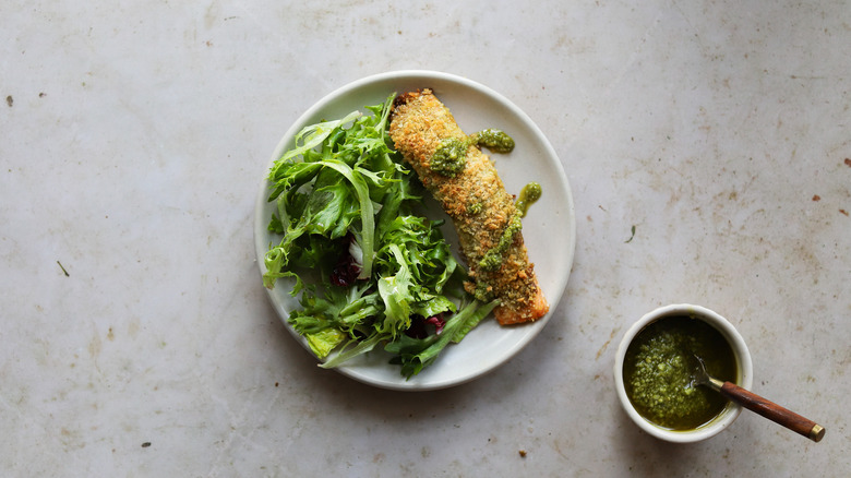 Looking for a way to shake up your regular dinner rotation? There's a quick and easy option that might just be lurking in your pantry. The bright, fresh flavors of pesto go naturally with salmon's rich taste and texture, and thus pesto-crusted salmon is born. With just a few other ingredients, this combo can be transformed into a dinner main that comes together in less than 20 minutes. Topped with a crispy, crunchy crust, a baked pesto salmon is both delicious and nutritious.
