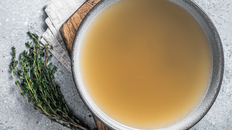Water is essential to life on earth, but it's not vital for boiling your potatoes. If you want to enhance the taste of your potatoes without a lot of extra legwork, boiling in something other than water might be your best choice. Broth, whether you pick beef, chicken, vegetable, or something else on the market, can not only add a salty component but also allow the tubers to absorb some of the liquid. The broth is a great cooking liquid swap that you likely already have in your pantry. You may also use stock if you have that instead.