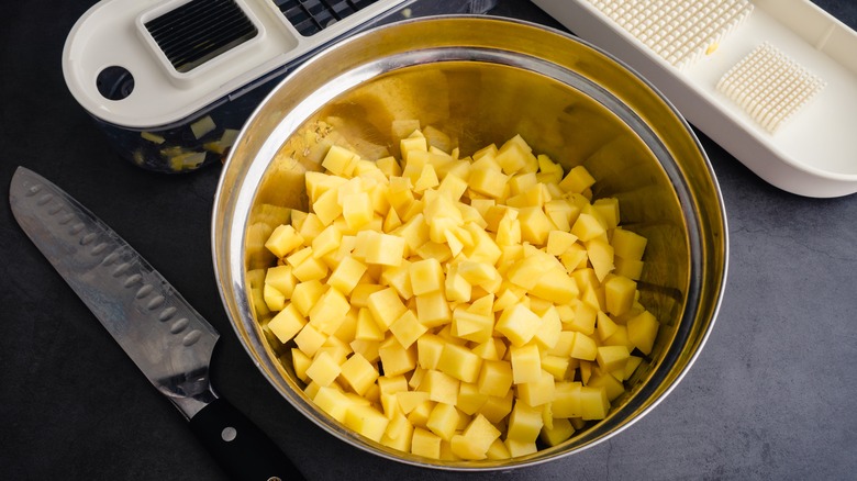 To cure this, apply this top: Cut your potatoes evenly in a simple large dice. Evenness is just as helpful as shape. You don't have to do anything fancy, such as any type of wedges or slices since these will all ultimately end up smooshed. Use a sharp knife and chop away. This rule for preparing mashed potatoes will give you an even texture every time, which is useful so you aren't left with a combination of mushy spuds as well as hard and lumpy ones.
