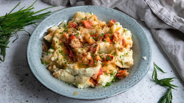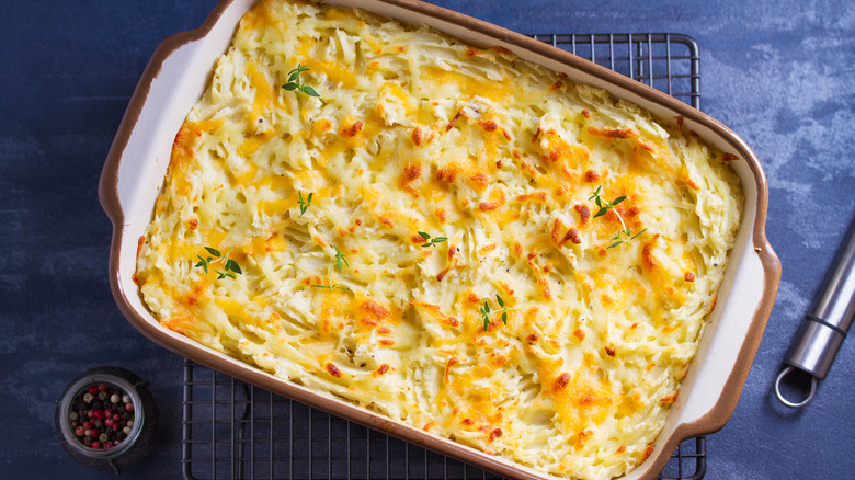 If you're a baked potato fan, you might want to try baking your mashed potatoes. It has your classic combination of butter, milk, and tubers, but you get to cook them again during a baking process in a similar vein to twice-baked potatoes. Boil, mash, and season your tots appropriately, then drop them into a nicely buttered baking dish. Place them in the oven to heat thoroughly, and if need be, broil for a minute or two toward the end to give it a slight crust.