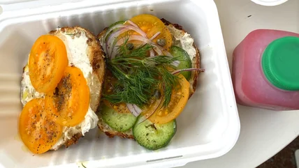 While you might be spending more on a bagel than you're used to, I will credit Courage Bagels for providing options. One thing that stood out to me was that you could opt for half of a bagel for a fraction of the full price, or even mix and match with another half of any of the other bagels on the menu. If you're indecisive like me, this option will come in handy. On my second visit to Courage Bagels, I was craving my original choice, but also wanted to try something new. I went for half of the tomato and cream cheese and another half of the "run it thru the garden" bagel, both with vegan cream cheese. The added cucumbers, onions, capers, and fresh dill sprigs added color and texture to my plate and my palate. Paired with locally sourced blood orange juice, I left ready to take on the rest of my Saturday.