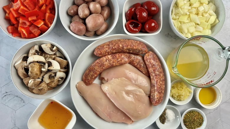 As we mentioned above, the stew is made with chicken breasts (boneless and skinless) and Italian sausages (which can be with or without casing, as you prefer) along with an onion, red potatoes, cremini mushrooms, bell peppers, and Peppadews (peppers and brine). You're also going to need avocado oil, garlic, chicken stock, salt, pepper, and Italian seasoning.